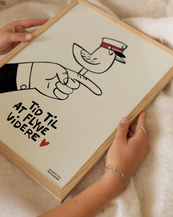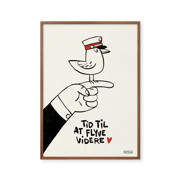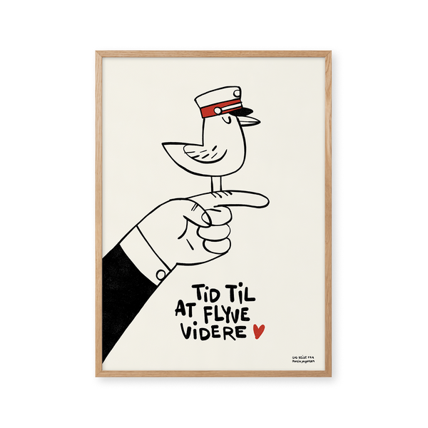 The art poster "Student - red" by Martin Jørgensen, curated by Peléton, is an inspiring and symbolically illustrated poster. This poster shows a hand holding a small bird wearing a graduation cap, ready to fly away. The poster's message, "Time to fly on," written with a red accent, highlights the transition from student life to new adventures and opportunities. With its simple yet powerful visual elements, the poster is designed to resonate with students facing a new phase in their lives, filled with hope and excitement for the future.