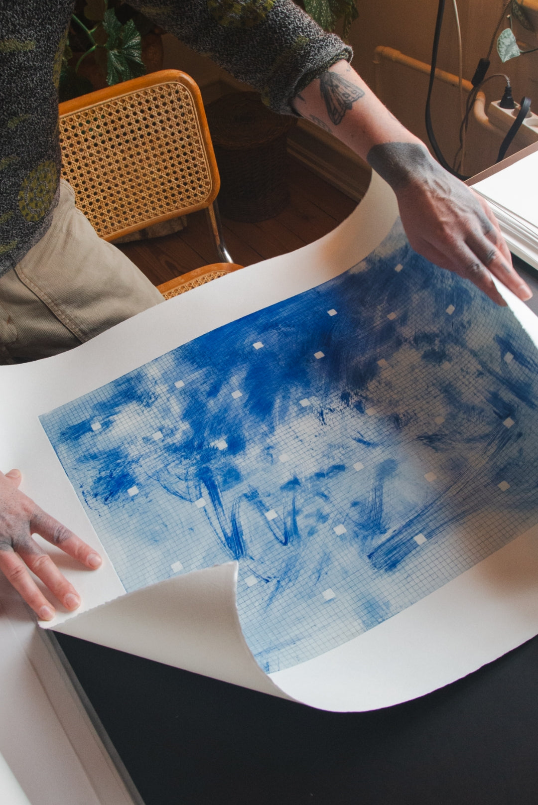I serien af monotypiske tryk tager Julie afsæt i det kvadrerede matematikhæfte. Her fungerer griddet som et regelsæt for systematik og gentagelse, men gentagelserne bruges til at åbne et mere frit, drømmende rum. Det stringente mønster, ætset i kobberpladen, står i kontrast til den påførte tryksværtes dybe og bløde farver, hvilket skaber en spænding mellem det stramme og det levende.