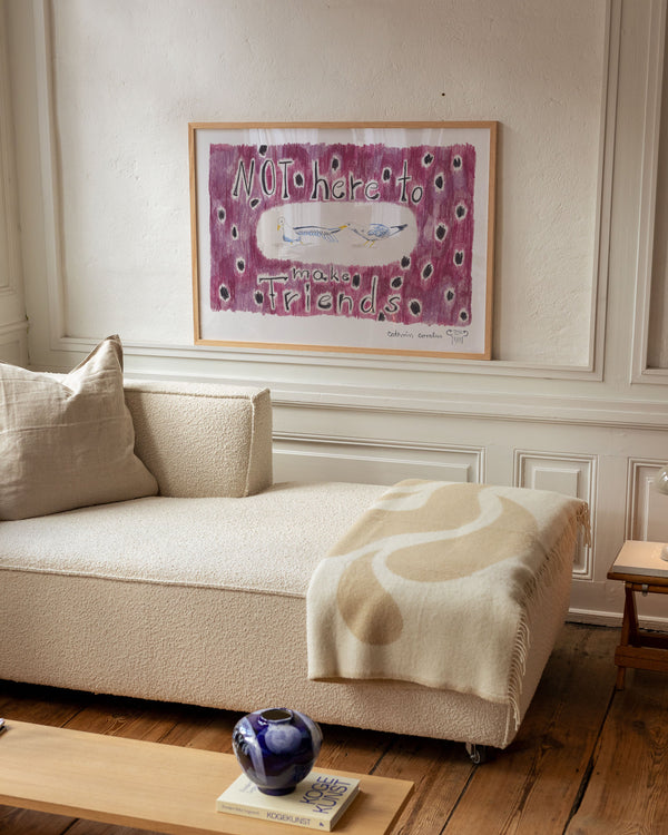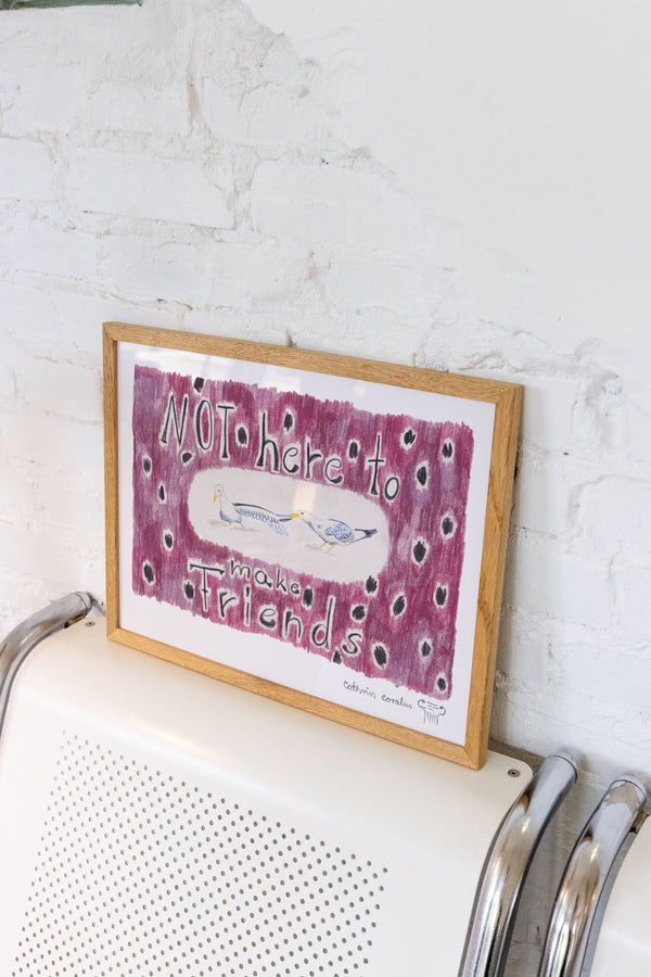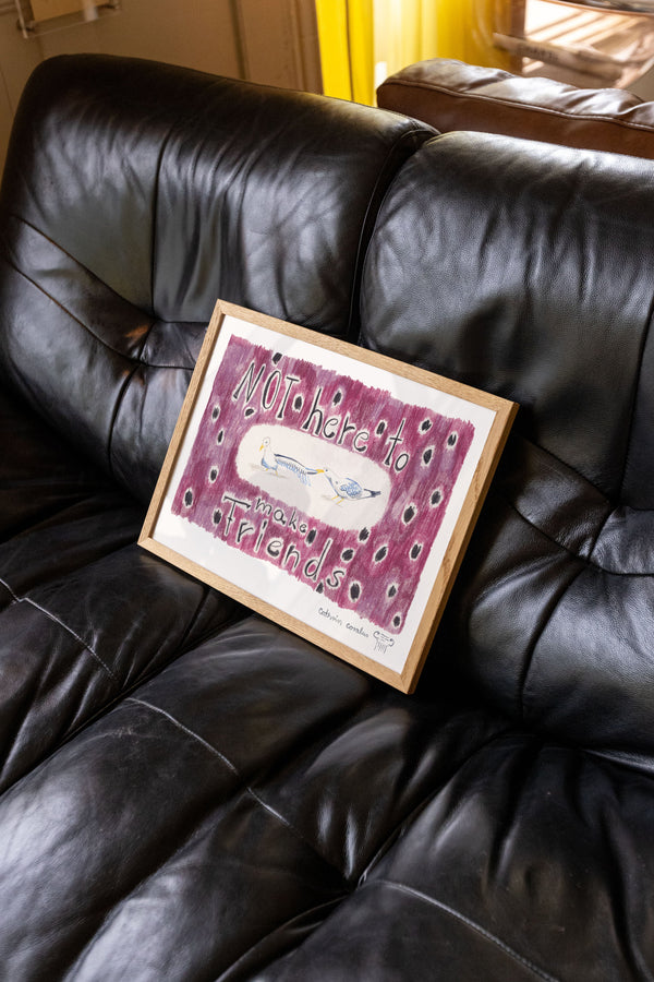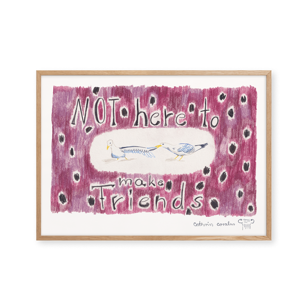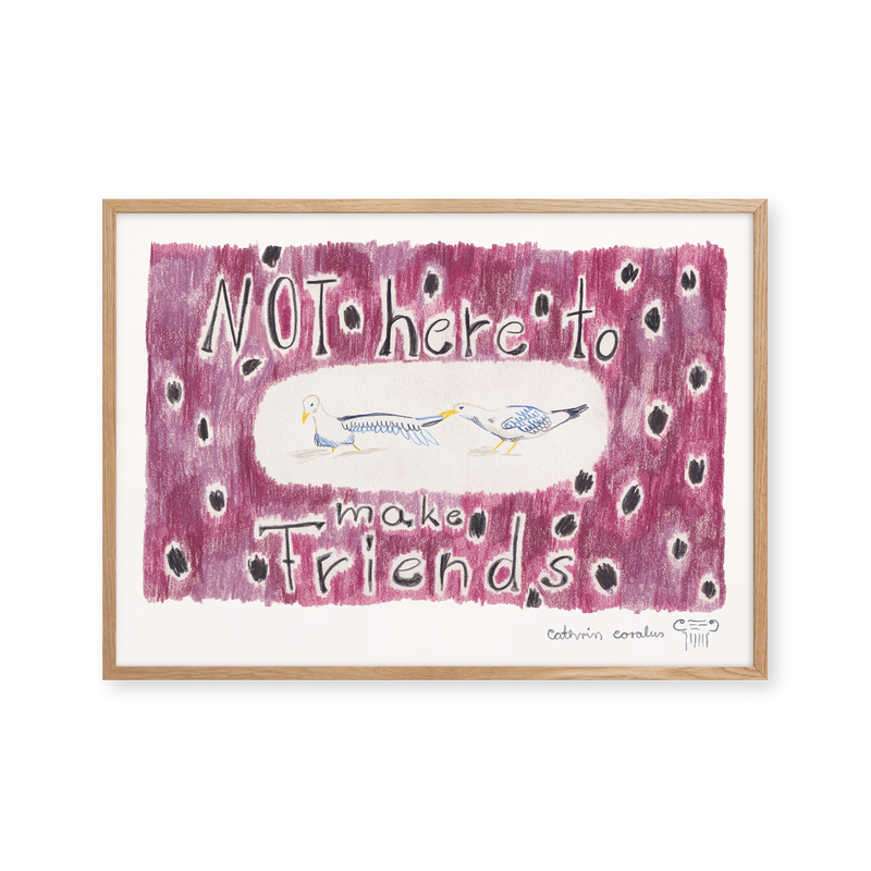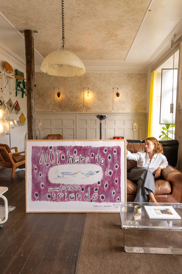 Cathrin Coralus kunstplakat "Not here to make friends" er en del af en farverig kollektion skabt eksklusivt til Peléton. Motiverne hylder legende kompositioner, stærke farver og Cathrins finurlige billedunivers, hvor sentimentale temaer og en kunstnerisk lethed går hånd i hånd.