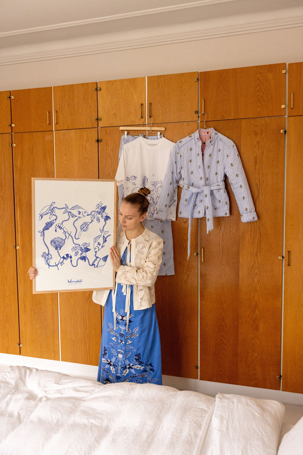 Kunstplakaten "Ocean Garden – Blue" er malet af Emilie Helmstedt og indgår i den eksklusive kunstserie Peléton x Helmstedt, hvor interiør, design og fashion smelter sammen i et fælles univers. Et helt unikt samarbejde, som kun kan opleves her.