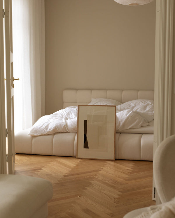 The Frames in oak are made of solid oak. The dark variant is stained to achieve a deep, warm tone, while the black Frame is made of black-painted pine with the same elegant profile.