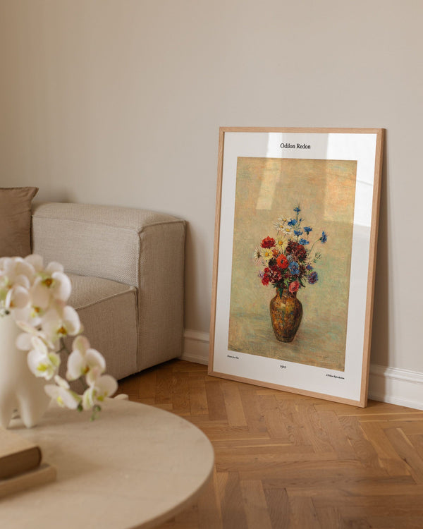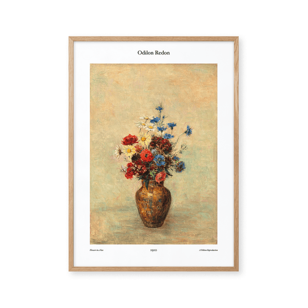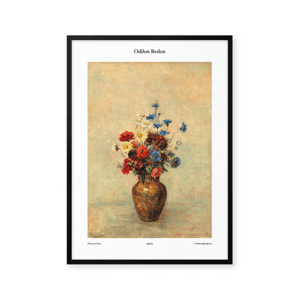 The art print: "Flowers in a Vase" by the artist Odilion Redon is a painted print, recreated by Peléton. This print series with Odilion Redon's art prints is characterized by his detailed paintings of colorful flowers. This print is part of Peleton's vintage collection with museum layout. The art print is produced on quality paper with long durability, high opacity, and detailed color reproduction.