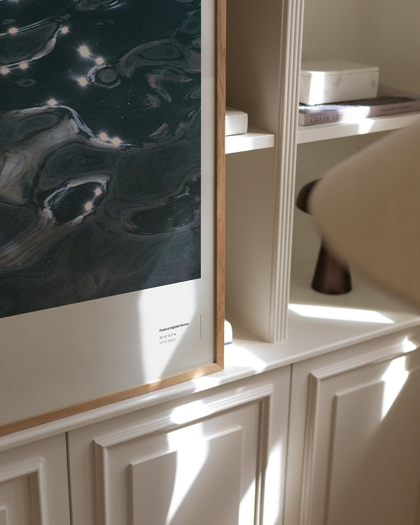 Our frames are made from high-quality materials and are available in solid oak, dark-stained oak, and black-painted pine. All frames come with real glass, while the largest sizes (70 × 100 cm and 100 × 140 cm) feature 2 mm acrylic glass, which looks like glass but is lighter and more shatter-resistant (durable).