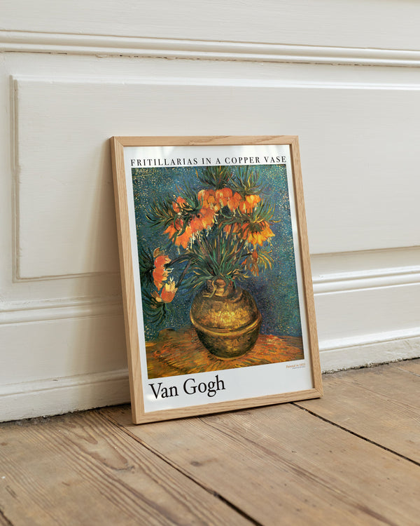Art poster: “Fritillarias in a copper vase” by the artist Vincent van Gogh is an abstract illustrated poster, recreated by Peléton. This poster is part of Peléton's vintage collection with museum layout. The art poster is produced on quality paper, with long durability, high opacity, and detailed color reproduction.