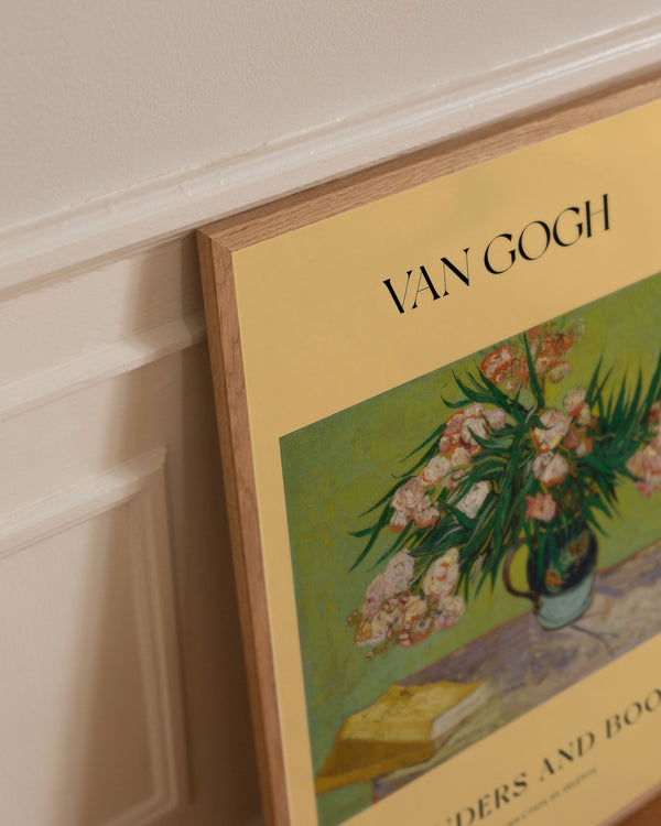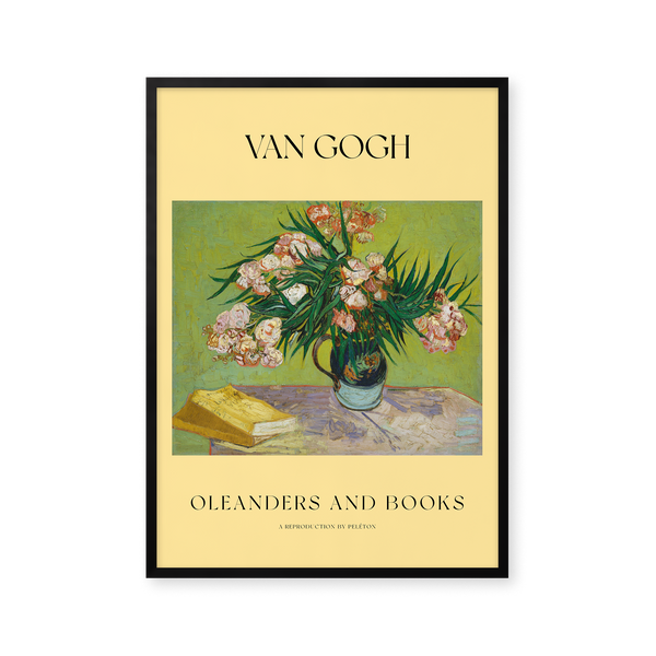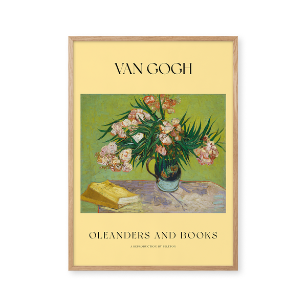 The art print: "Oleanders and Books" by the artist Vincent van Gogh is a painted poster recreated by Peléton. This poster series with Vincent van Gogh's art prints is characterized by his artworks with strong colors and dramatic, impulsive, and expressive brushwork. This poster is part of Peleton's vintage collection with museum layout. The art print is produced on quality paper with long durability, high opacity, and detailed color reproduction.