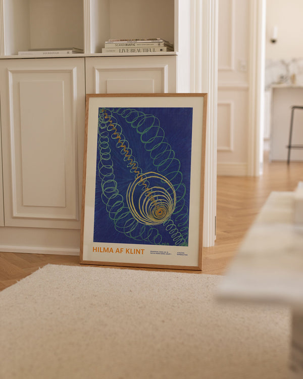 The art print: “Primordial Chaos, No. 16” by the artist Hilma af Klint is an abstract illustrated print recreated by Peléton. This print series with Hilma af Klint's unique and abstract art prints is characterized by her inventive and personal expression. This print is part of Peléton's vintage collection with museum layout. The art print is produced on quality paper, with long durability, high opacity, and detailed color reproduction.