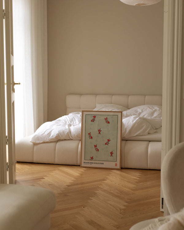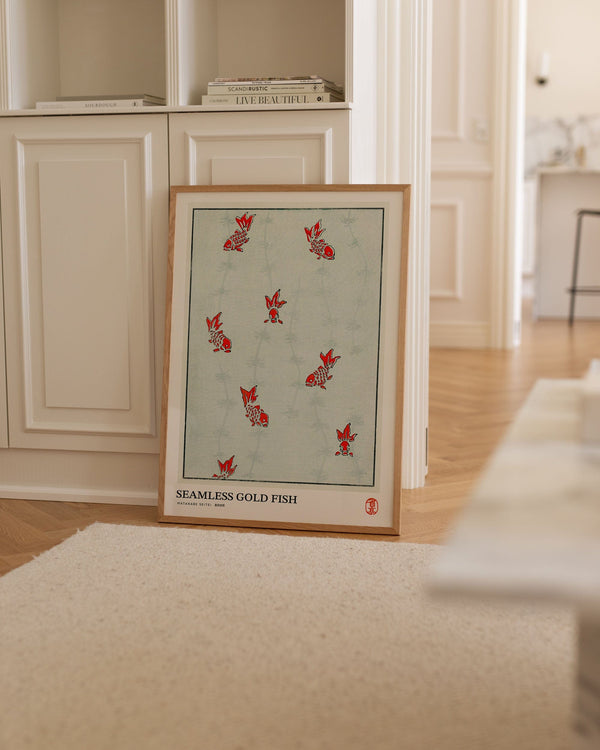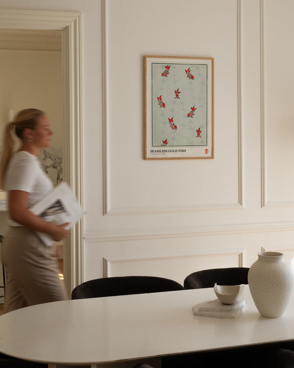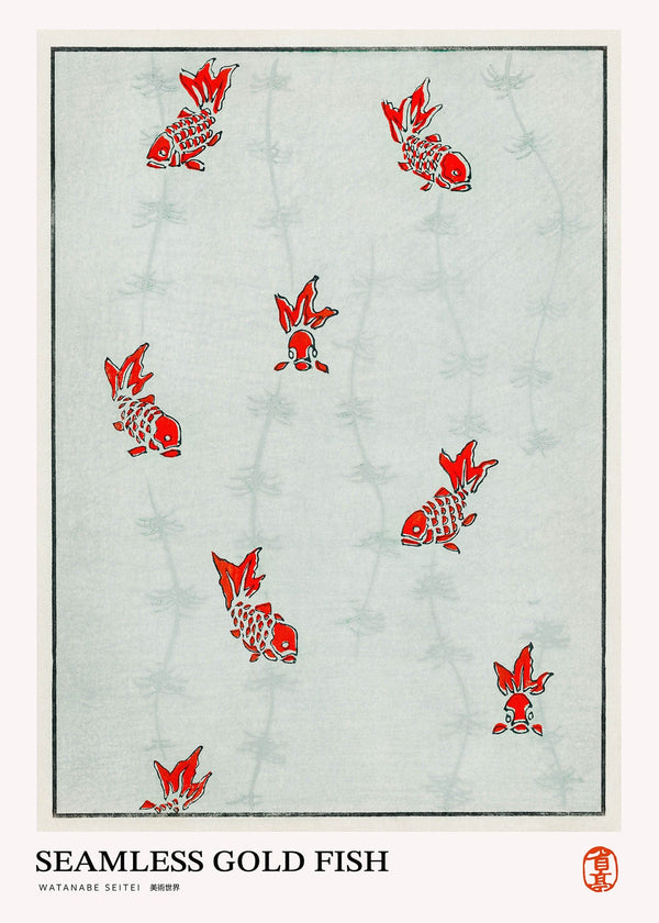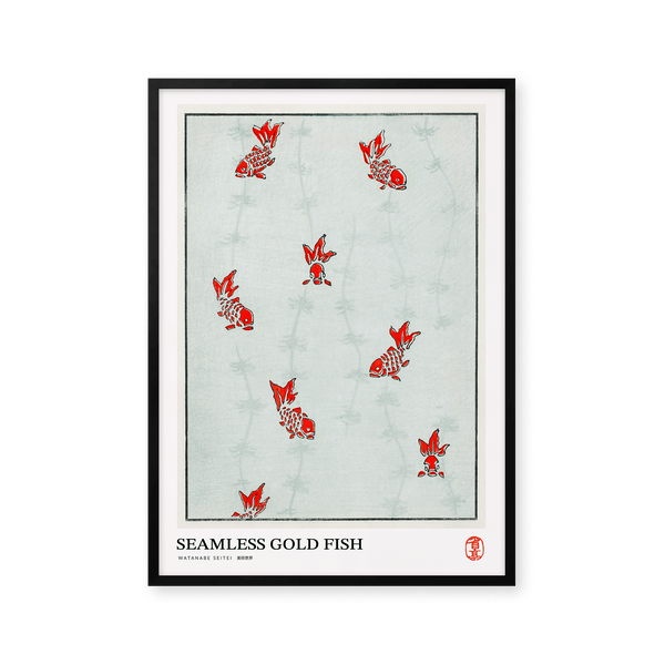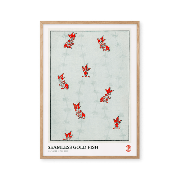 The art print: "Seamless gold fish" by the artist Watanabe Seitei is a poster that Peléton has recreated based on his iconic woodcut. This poster series with Watanabe Seitei art prints is based on his most famous works. This poster is part of Peleton's vintage collection with museum layout. The art print is produced on quality paper with long durability, high opacity, and detailed color reproduction.